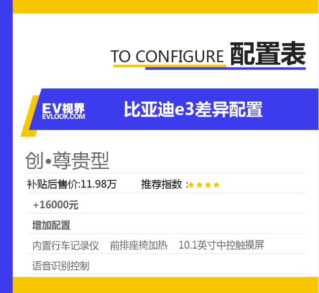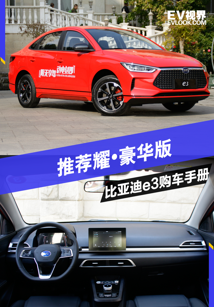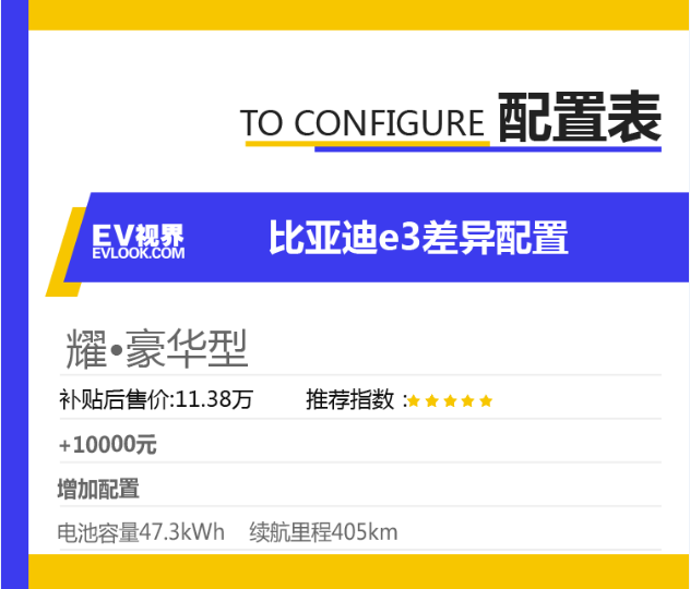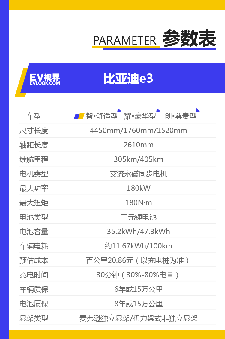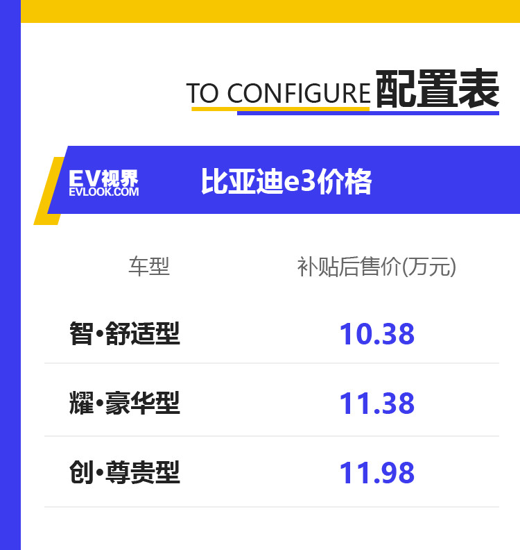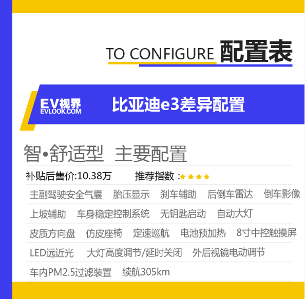 比亚迪e3 (配置|询价)在2019年10月24正式上市,新车共推出智·舒适型、耀·豪华型、创·尊贵型共3款车型,官方指导价10.38万-11.98万(综合补贴后)。其中智·舒适型工况续航里程为305km,耀·豪华型与创·尊贵型工况续航里程为405km。今天EV视界的小编就带您分析一下,到底哪款车型最值得购买。