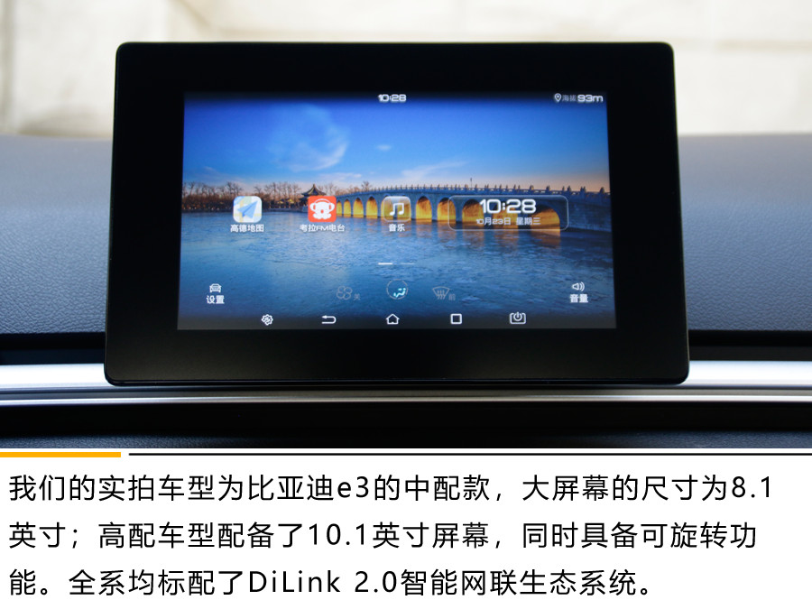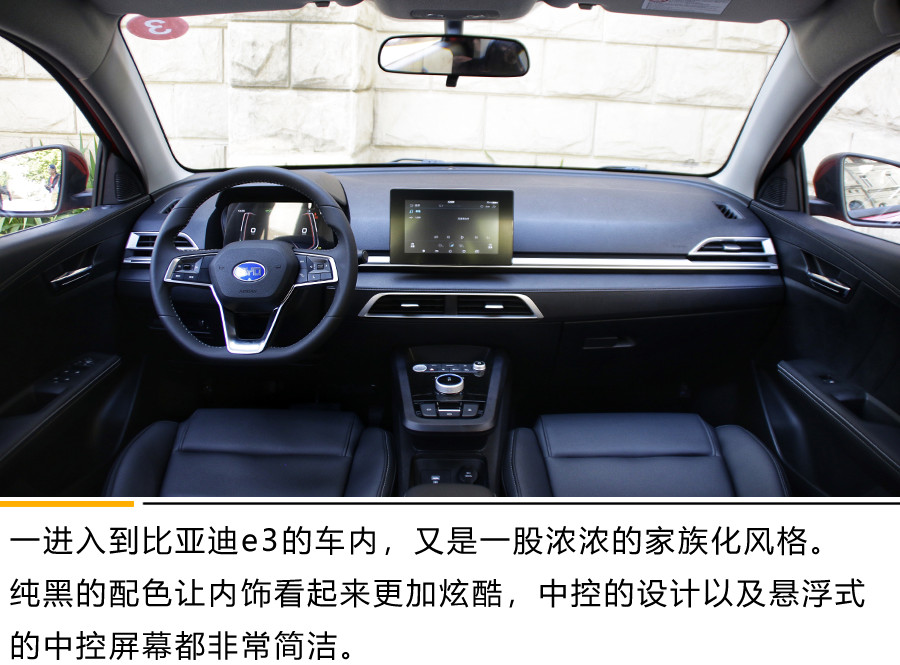 一进入到比亚迪e3的车内,又是一股浓浓的家族化风格。纯黑的配色让内饰看起来更加炫酷,中控的设计以及悬浮式的中控屏幕都非常简洁。
