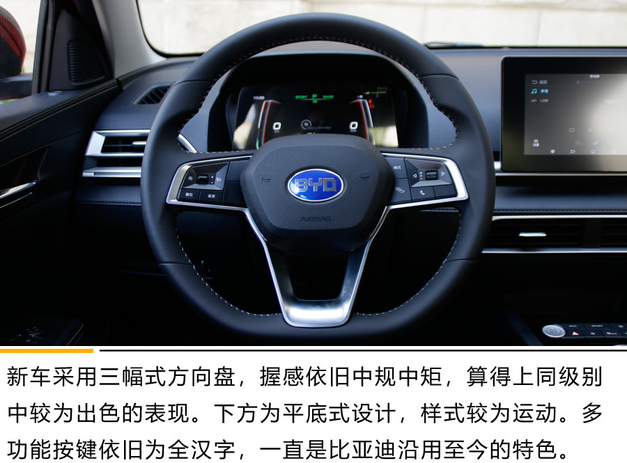 新车采用三幅式方向盘,握感依旧中规中矩,算得上同级别中较为出色的表现。下方为平底式设计,样式较为运动。多功能按键依旧为全汉字,一直是比亚迪沿用至今的特色。