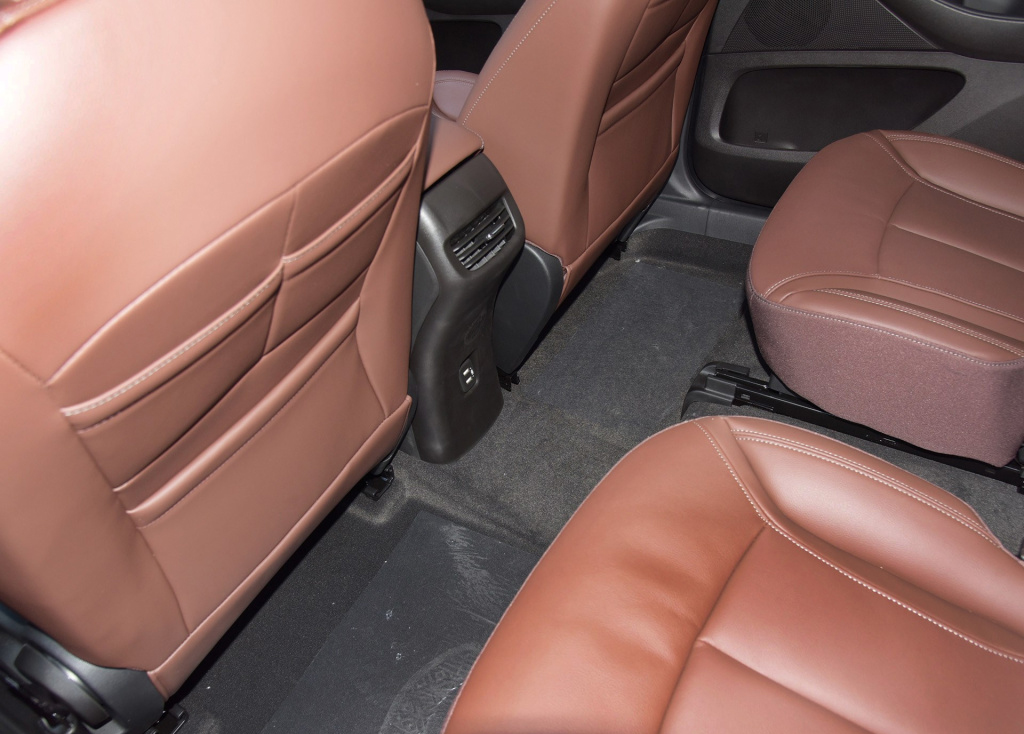 除了车长带来更宽裕的腿部空间,第三排两侧的车窗设计得也很大,再加上尾门的大风挡,第三排乘客几乎不会有什么压抑感,视野非常开阔。而且为了节省后备厢的空间GM6的备胎放在了第一排与第二排座椅之间的地板下。
