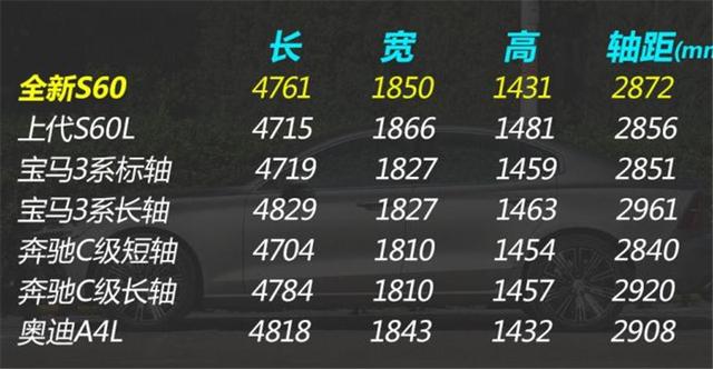 目前在国内能买到的沃尔沃S60有进口版本和国产版本,国产版由于加长了轴距,所以叫S60L。不过根据此前曝光的申报信息来看,全新一代国产S60并不会加长轴距,新车的车身尺寸与海外版保持一致,其长宽高分别为4761/1850/1431mm,轴距为2872mm。
