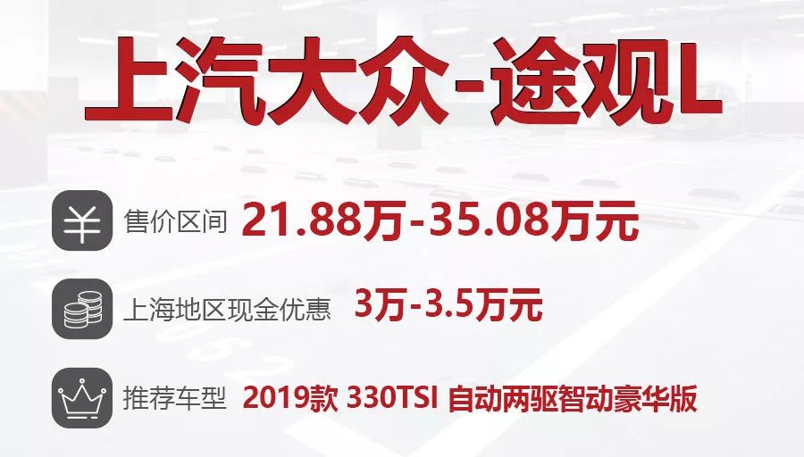 大众途观 (配置|询价)L也是在国内市场上热度极高的中型SUV。目前小智通过论坛以及4S店探访了解,目前上海4S店内报价综合优惠普遍在4万至4.5万,其中包含二手车置换补贴8000元(需在店内置换),办理一年贷款,缴纳全额保险。另外普遍要收取3000元左右的购车服务费,贷款手续费等费用。如果全款购车,根据配置不同,纯现金优惠在3万至3.5万元。