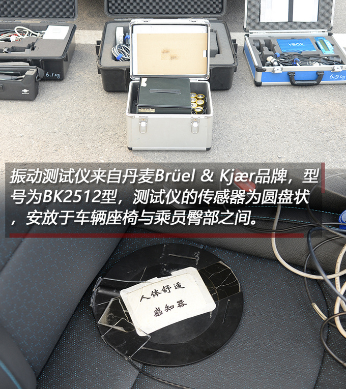 为了让测试成绩更加客观严谨,清华老师使用的专业仪器均来自世界范围内具有权威性的品牌,例如既可测试加速性能,同时还可用于车速表校准的车速测试仪VBOX Ⅲ,是英国瑞思捷RACELOGIC公司推出的一款基于高精度GPS的汽车测试设备;丹麦Brüel & Kjær声学和振动测量公司是声学和振动的测量、分析领域的全球领导者,是世界领先的测量仪器制造商,旗下产品BK2512振动测试仪能够精准测出座椅的舒适性,测试仪的传感器为圆盘状,安放于车辆座椅与乘员臀部之间。