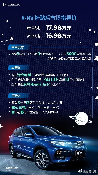 X-NV共推出风驰版、电掣版两款车型,补贴后市场指导价分别为16.98万、17.98万,并同步推出回馈消费者丰富贴心的“FUN心用”政策。