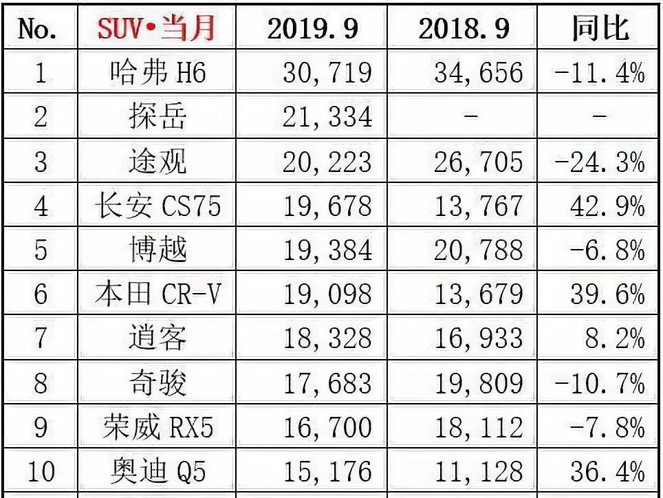 根据乘联会2019年9月综合销量排名快报,9月的SUV销量为80.9万辆,同比增长0.6%,环比增长14.5%。1-9月的SUV累计销量为645.2万辆,同比下降5.8%。9月SUV销量排行榜前十名由高到低分别是:哈弗H6 (配置|询价)、探岳、途观、长安CS75、博越、本田CR-V、逍客、奇骏 (配置|询价)、荣威RX5、奥迪Q5。