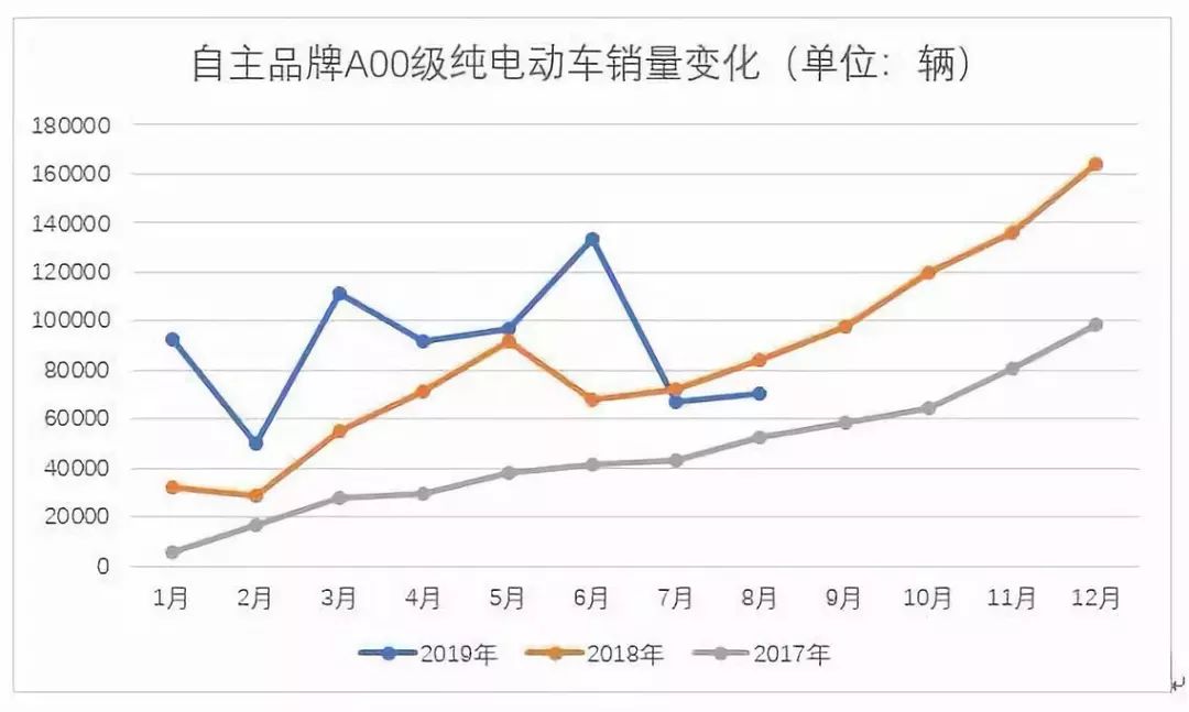 危机有多大呢?根据乘用车市场信息联席会的数据,A00级纯电动车的市场份额在2017年时曾高达69%,哪怕在2018年6月被调整后的补贴政策打到33%,最后都能借助国家打击低速电动车的东风,以及车厂全力转战分时租赁与网约车市场的收获,从而让市场份额回到49%以上。