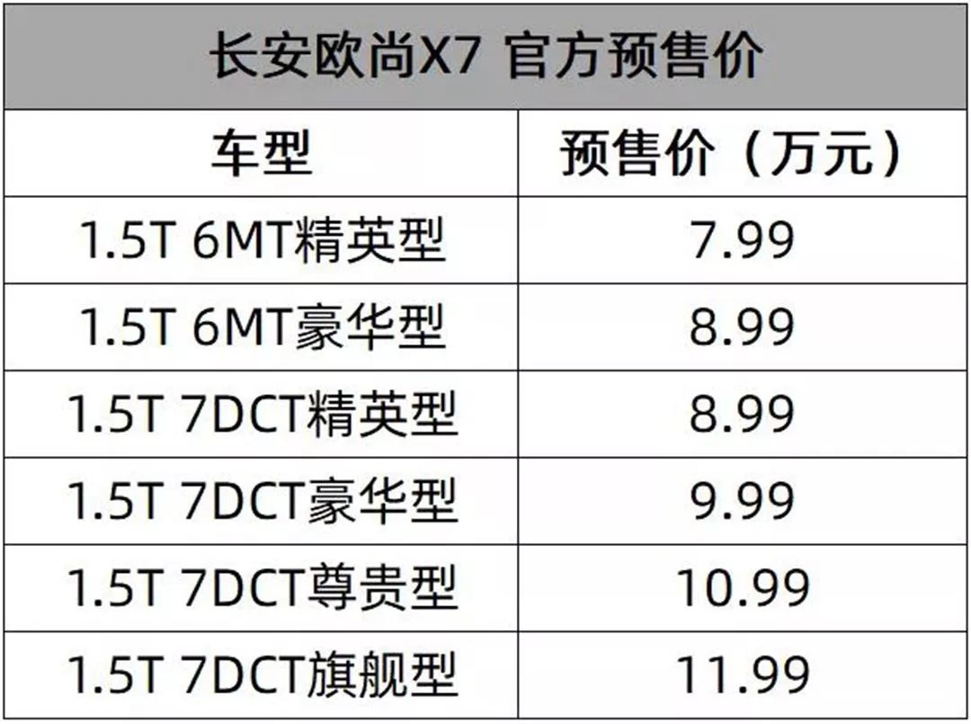 10月8日上午,长安欧尚X7预售价格发布,新车推出手动挡和自动挡共6款车型,预售价格区间为7.99万元-11.99万元,并同期正式开启预售。欧尚作为一个长安旗下的新品牌,在这几年一直以更高的配置、更大的尺寸、更强的的动力、更低的售价来与同级对手竞争,欧尚系列可以说是把田忌赛马的策略贯彻得最到位的汽车品牌了。当然这一次也不例外,欧尚X7打的还是“越级战”。
