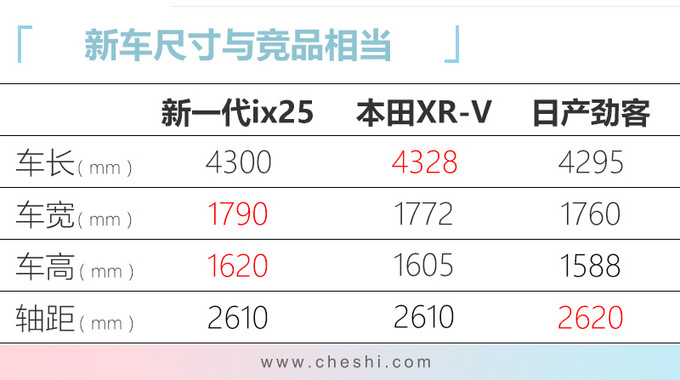 内饰部分,新一代ix25采用了更加时尚的设计风格,大面积由米色内饰及镀铬元素点缀,10.4英寸中控大屏内置百度智能网联3.0系统,并支持百度CarLife互联系统,且首次搭载车内环绕式氛围灯。配置方面,新车配有的360°全景影像功能可在打开左、右转向拨杆时将一侧的影像画面反馈到中控屏上,进一步保障行车安全。此外还提供前碰撞预警制动、LDWS车道偏离预警、LKA车道保持辅助以及远近光灯智能调节等,主被动安全配置较老款车型提升明显。