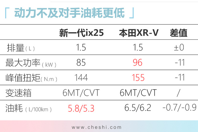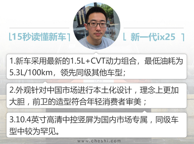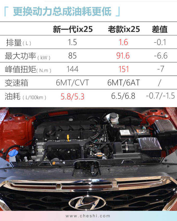 动力方面,新一代ix25采用1.5L+CVT的动力组合取代了老款的1.6L+6AT,手动挡和自动挡车型油耗均低于老款1.6L车型。此外值得补充到的是,新车采用的全新CVT变速箱区别于传统的变速箱,其使用推动式链带代替了推片式钢带,可承受更大的扭矩输出,降低故障率的同时也提升了效率及燃油经济性。