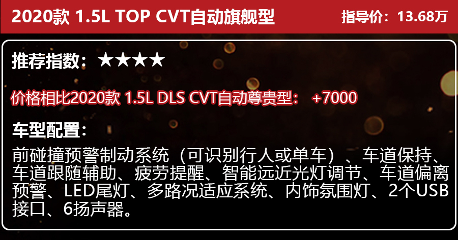 次推售价为13.68万的2020款 1.5L TOP CVT自动旗舰型车型。该版本为新一代ix25的顶配版本,之所以推荐该版本车型,因为其搭载了丰富的智能驾驶辅助配置,可以进一步提升驾控的便利性,另外,多路况适应系统的加持也提升了其驾驶质感。