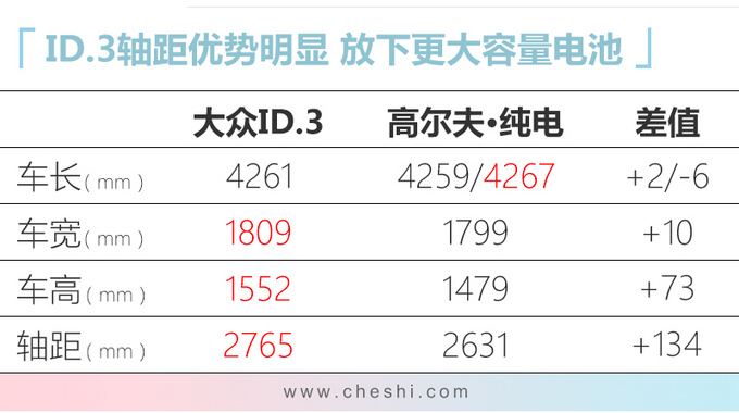 得益于MEB纯电动车专属平台,大众ID.3在尺寸与高尔夫·纯电相当的情况下,轴距优势更加明显,为底盘中央电池组留出了更多的空间。动力方面,大众ID.3搭载一台后置永磁同步电机,最大功率为150kW,峰值扭矩310N.m,最高时速为160km/h,未来还将有望推出双电机驱动模式版本车型。新车在使用ID壁挂快充时(输出功率为100kW),仅需30分钟即可充入支持行驶290km所需的电量。