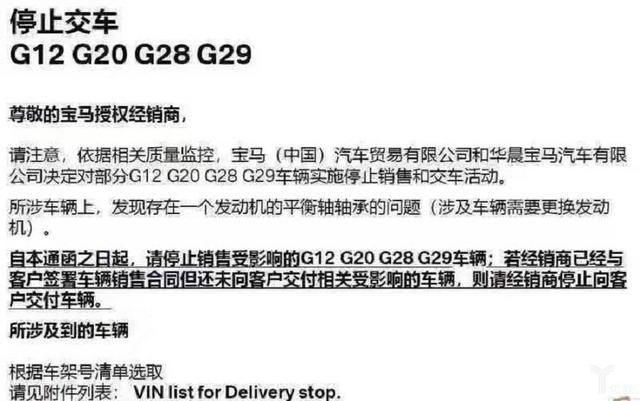 信件内容如下:宝马(中国)汽车贸易有限公司和华晨宝马汽车有限公司要求在华授权经销商对部分新7系 (配置|询价)(G12)、新3系 (配置|询价)的标轴版(G20)、新3系长轴版(G28)、新一代宝马Z4 (配置|询价)(G29)车型停止销售和交付。原因是,发现相关车型存在一个发动机的平衡轴承的问题。