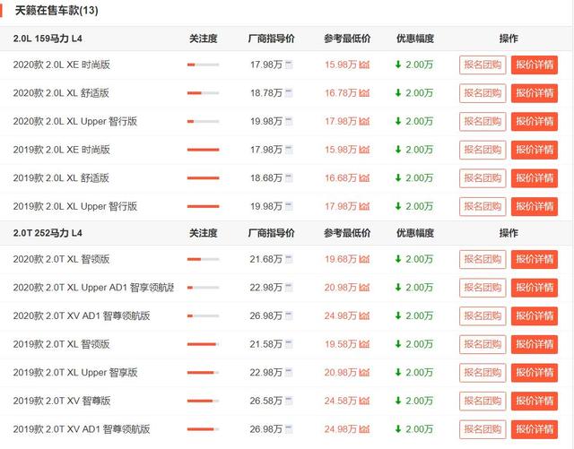 目前,只要是购买日产天籁的用户均可享2万元以上的现金优惠,优惠后价格被控制在16-25万元,并且2.0T车型最低也不到20万。同时,当前购车也无附加条件,车身颜色也可选。