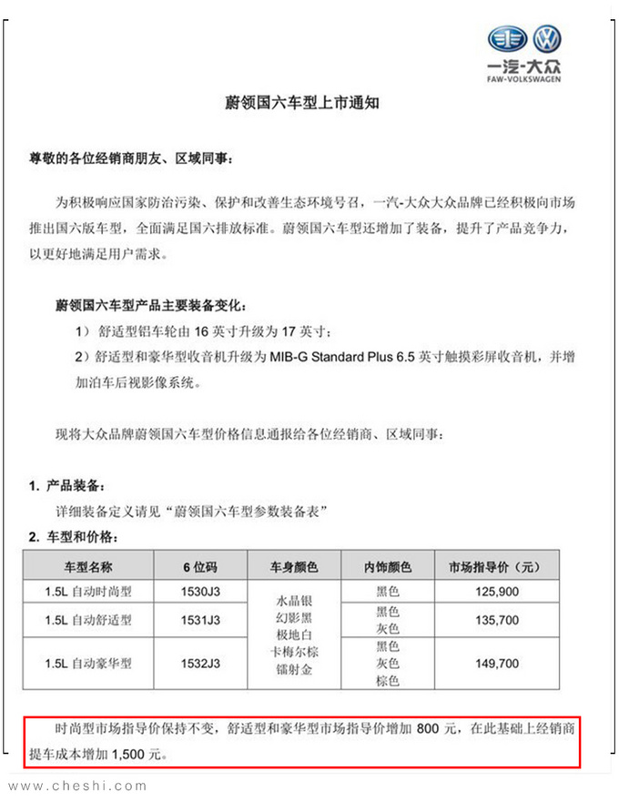 近日网上车市从一汽-大众经销商处获悉,大众蔚领国六车型将在近期正式上市。新车仅推出3款1.5L车型,除发动机升级国六排放标准外,还对舒适版、豪华版两款车型进行了配置升级。价格方面,蔚领1.5L舒适版、豪华版上调800元,在此基础上购车还需再加价1,500元,相当于最终售价上调2,300元。