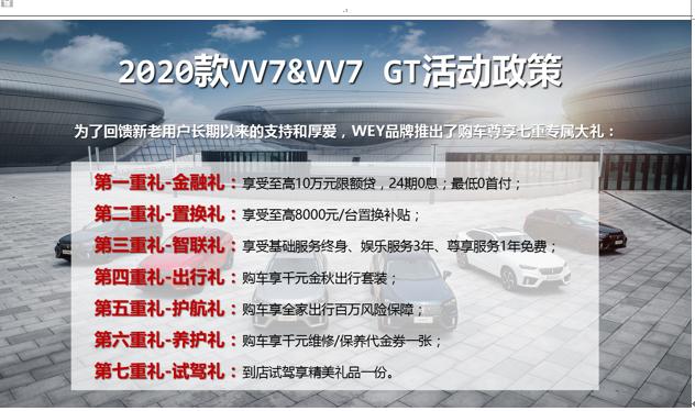 值此2020款VV7和VV7 GT杭州上市之际,WEY品牌还隆重推出了金融礼、置换礼、智联礼、试驾礼等尊享购车七重大礼,以答谢消费者的厚爱(专属政策详情请咨询当地经销商)。