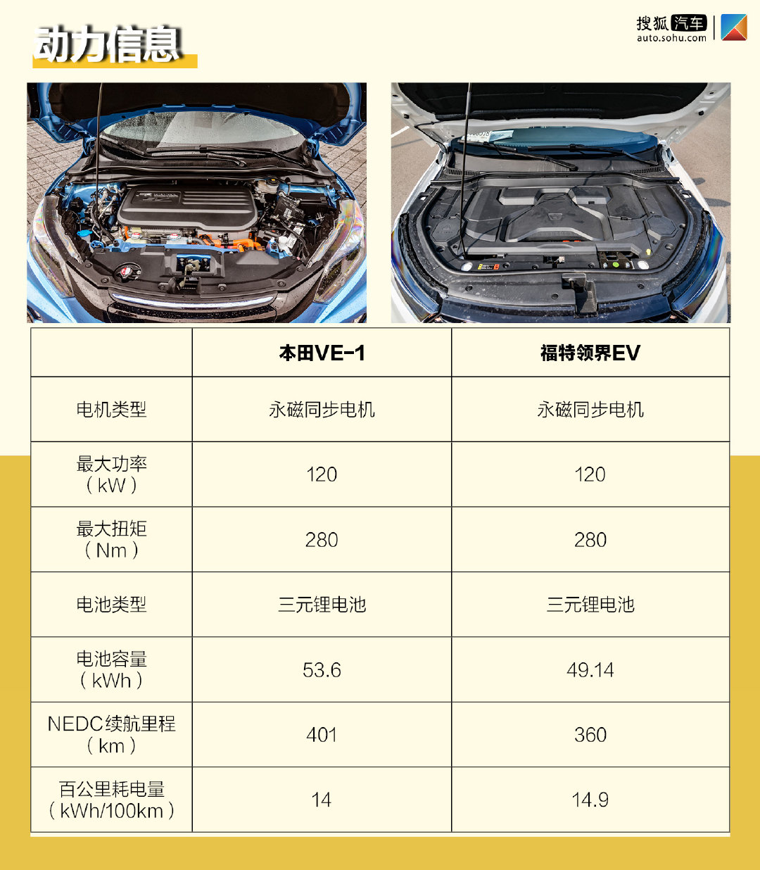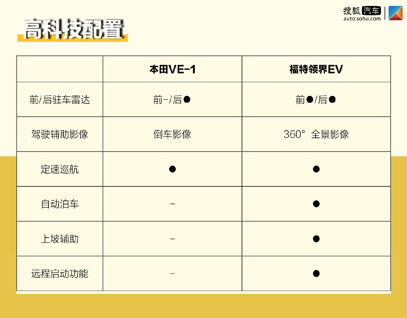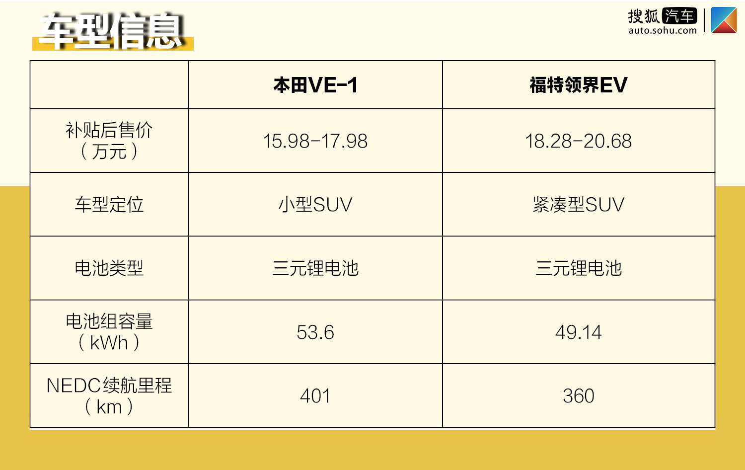 [·4·领界EV配置更高]总体来说,虽然两车定位、售价存在差异,但在各项对比中互有胜负,本田VE-1在消费者最为关心的续航里程和售价方面占优,却在空间和配置方面不及福特领界EV。而在合资品牌纯电SUV这个范畴中,两车都是不错的产品,可以说在售价、产品力、品质三者间找到了一个平衡点,没有明显短板。至于哪款更适合您,还是要从实际用车需求出发。