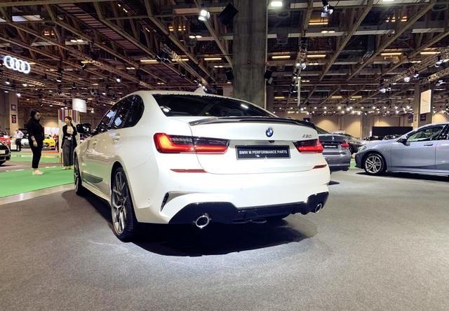 车身侧面,这台宝马3系330i M Performance为标轴版设计,侧面线条与比例看上去比国内的加长版更加协调。全新的20寸轮毂设计很新颖,运动感十分强烈,再配上蓝色的刹车卡钳,让它显得更加凌厉。车尾造型与普通版并无太大差别,全新的L型LED灯带在夜晚点亮后,显示效果非常出众。后备厢盖上的碳纤维尾翼及双边共两出排气布局的加入,提升了车尾的精致感。