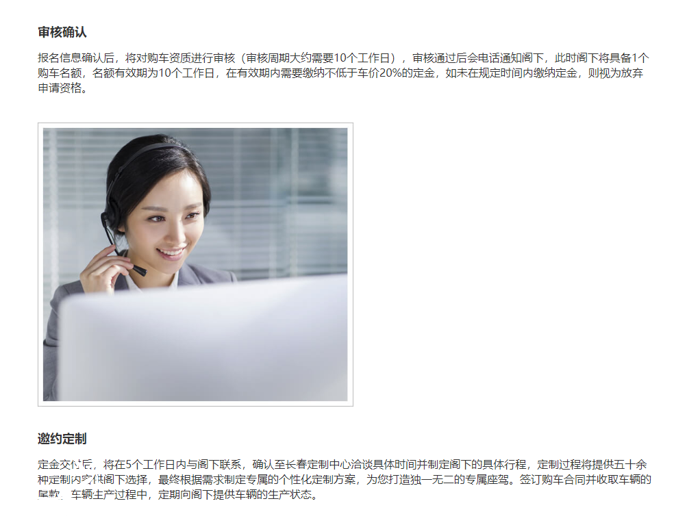 前不久,有人购买了一辆红旗L5轿车,光是定金就是120万人民币,缴纳定金意味着什么?意味着有资格购买。根据官网流程,申请报名-审核确认-邀约定制-座驾交付-售后服务,申请报名人人都可以,但是审核确认不是人人都能通过的,这是最关键的一步,审核通过后就要缴纳不低于车价20%的定金。