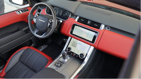 视线来到车内,揽胜运动版的内饰跟揽胜在造型上就没有太大区别了。但我们这台试驾车在车厢色彩的运用上还是相当不错的,采用了红黑的配色,同时搭Alcantara材质的顶篷,瞬间将这台车内饰的时尚感、运动感提升了一大截。