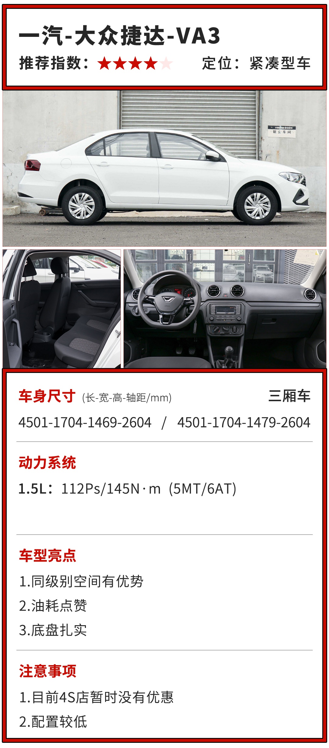 不过说是采用了MQB平台,但除了外形稍有变化外,内饰完全就是“捷达”。对于“熟悉”大众车型的朋友来说,选择VA3,你会对它很快上手。另外在配置上,除了售价6.58万元的最低配外,其余配置均有电动天窗,只是在配置上来说,整体还是偏低。