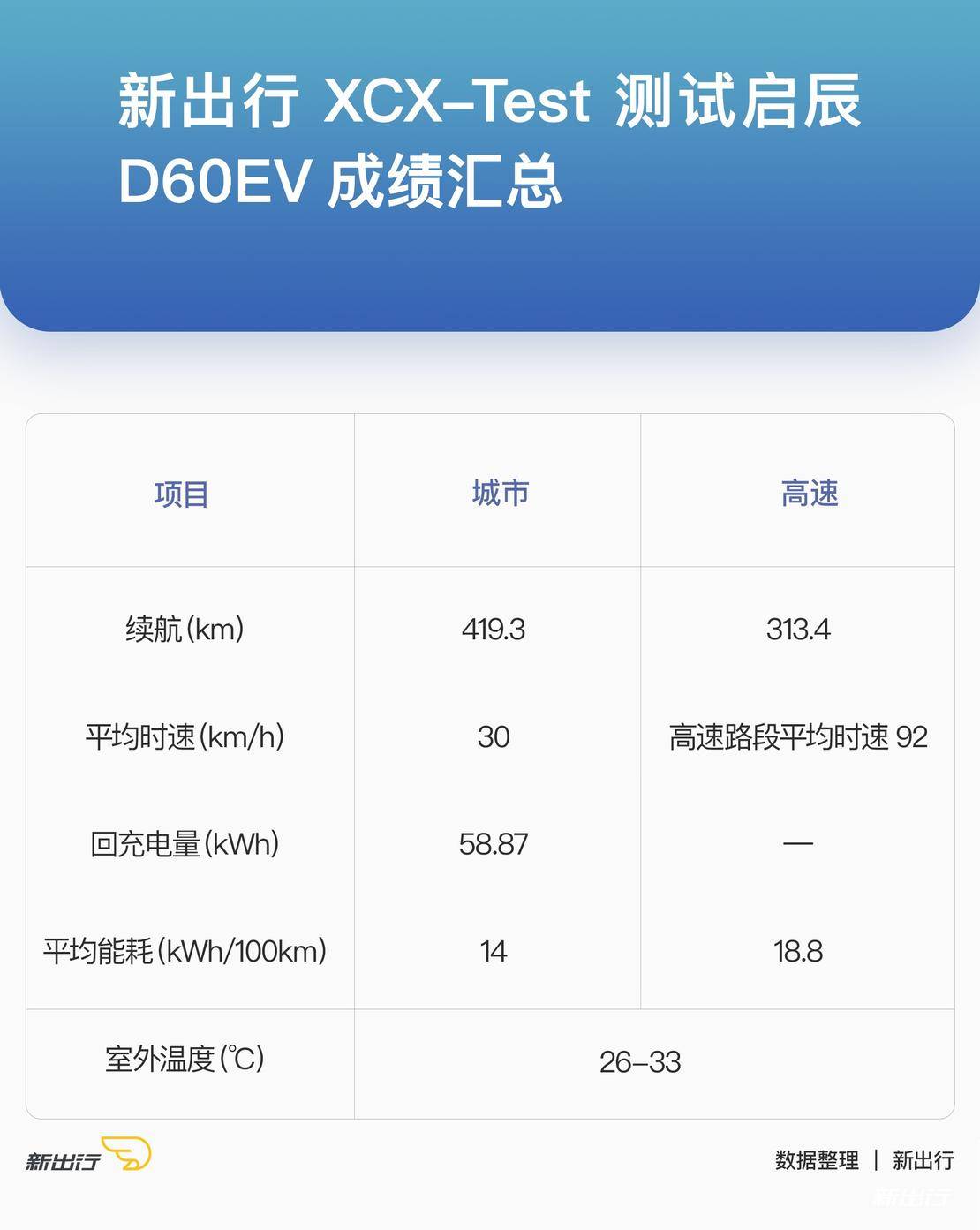最后,我们直接干脆的来汇总一波启辰 D60EV 在新出行 XCX-Test 标准下取得的成绩。另外,因驾驶方式和路况的不同续航测试结果仅供参考。