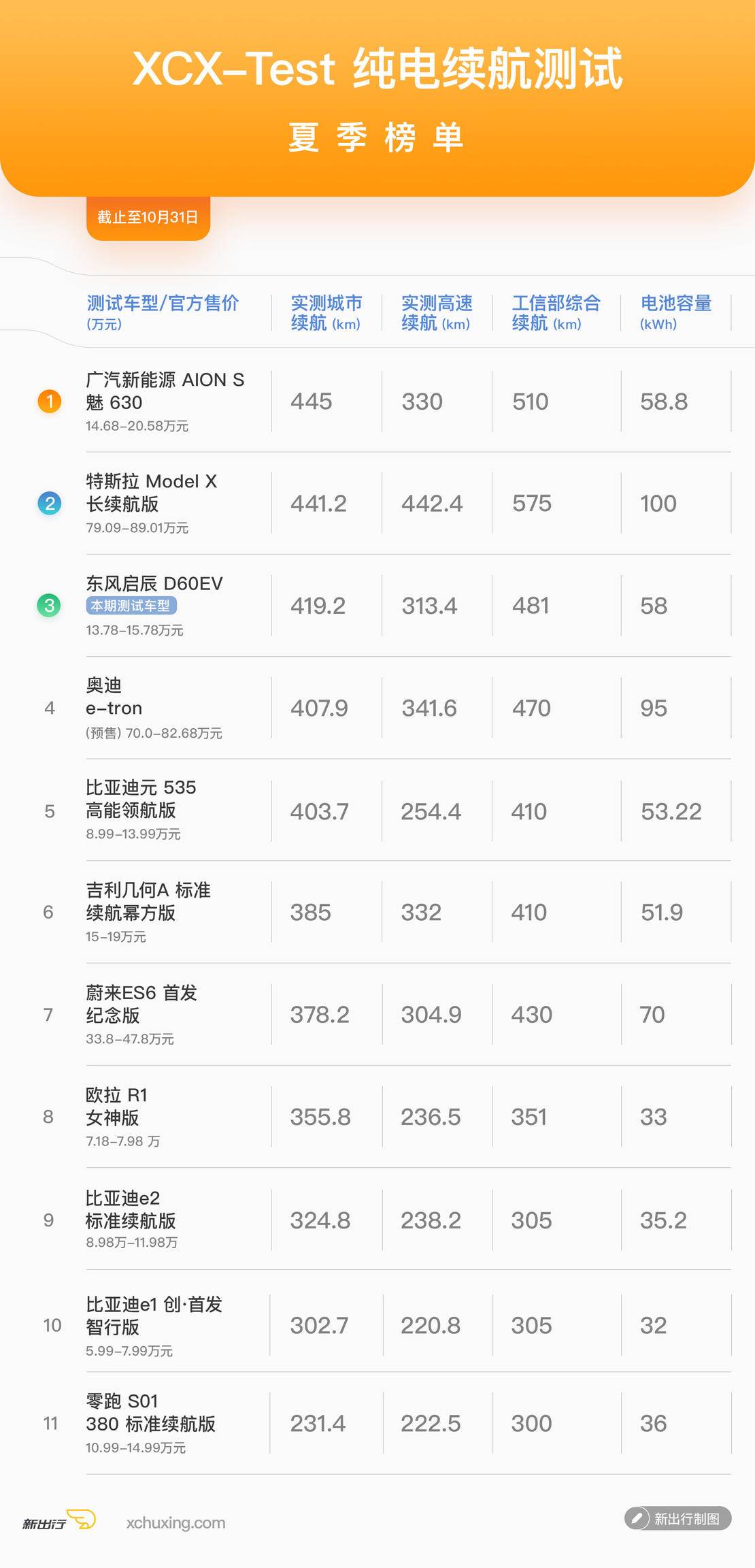 新出行 XCX-Test 测试纯电动车型夏季榜单