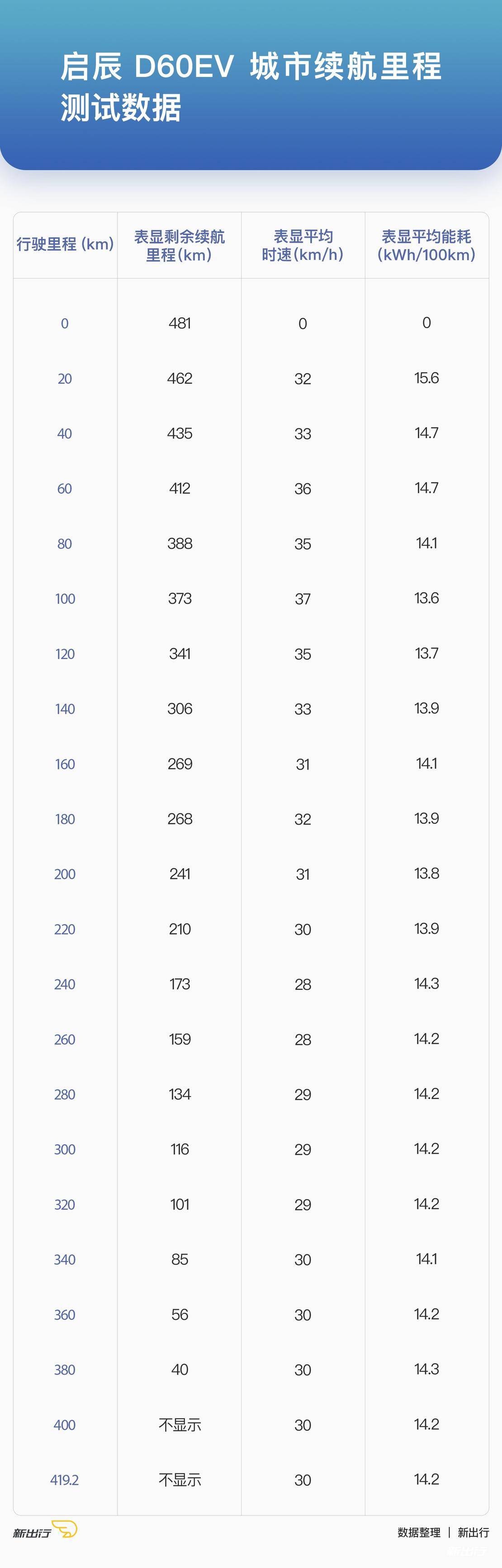 相信大家对启辰 D60EV 的续航表现已经有所了解,从新出行 XCX-Test 跑趴窝的测试结果来看,启辰 D60EV 的城市续航为 419.2km,达到了官方 NEDC 的 8.7 折左右,而高速续航成绩则为 313.4km。从整个测试结果来看,启辰 D60EV 在日常城市代步是更好。