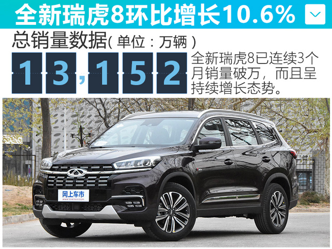 瑞虎8经过换代以后,产品力大幅提升,尤其是1.6T第三代动力的加入,使得百公里加速仅8.9秒,足以媲美如本田思域这样的运动轿跑;145kW最大功率,290N.m峰值扭矩,同级动力最强,足可比肩宝马的2.0T发动机。另外,在外观、内饰的设计上,全新一代瑞虎8也是下了很大功夫,充分满足了当下消费者对于一款中型SUV的审美需求。多维度的优化升级,让消费者对瑞虎8的喜爱程度进一步加强。全新一代瑞虎8自5月底上市以来,销量持续攀升,月销过万已成常态,而且呈持续增长态势。
