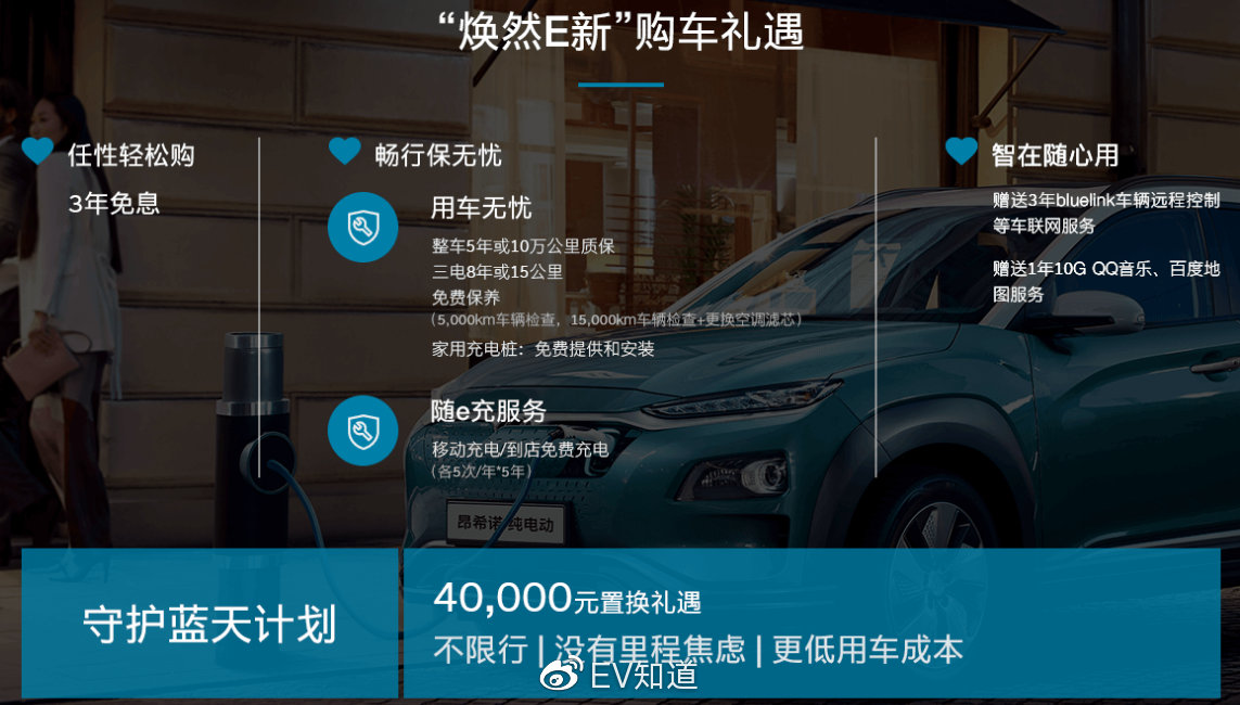 北京现代推出了昂希诺纯电动“焕然E新”购车礼遇:凡是购买昂希诺纯电动的用户,均可以享受3年免息贷款,整车5年或10万公里质保,三电8年或15万公里质保,还可免费获赠家用充电桩及安装服务。此外,还特别推出了“守护蓝天”计划:截至2019年12月31日前,购买昂希诺纯电动的用户将享有4万元置换礼遇。