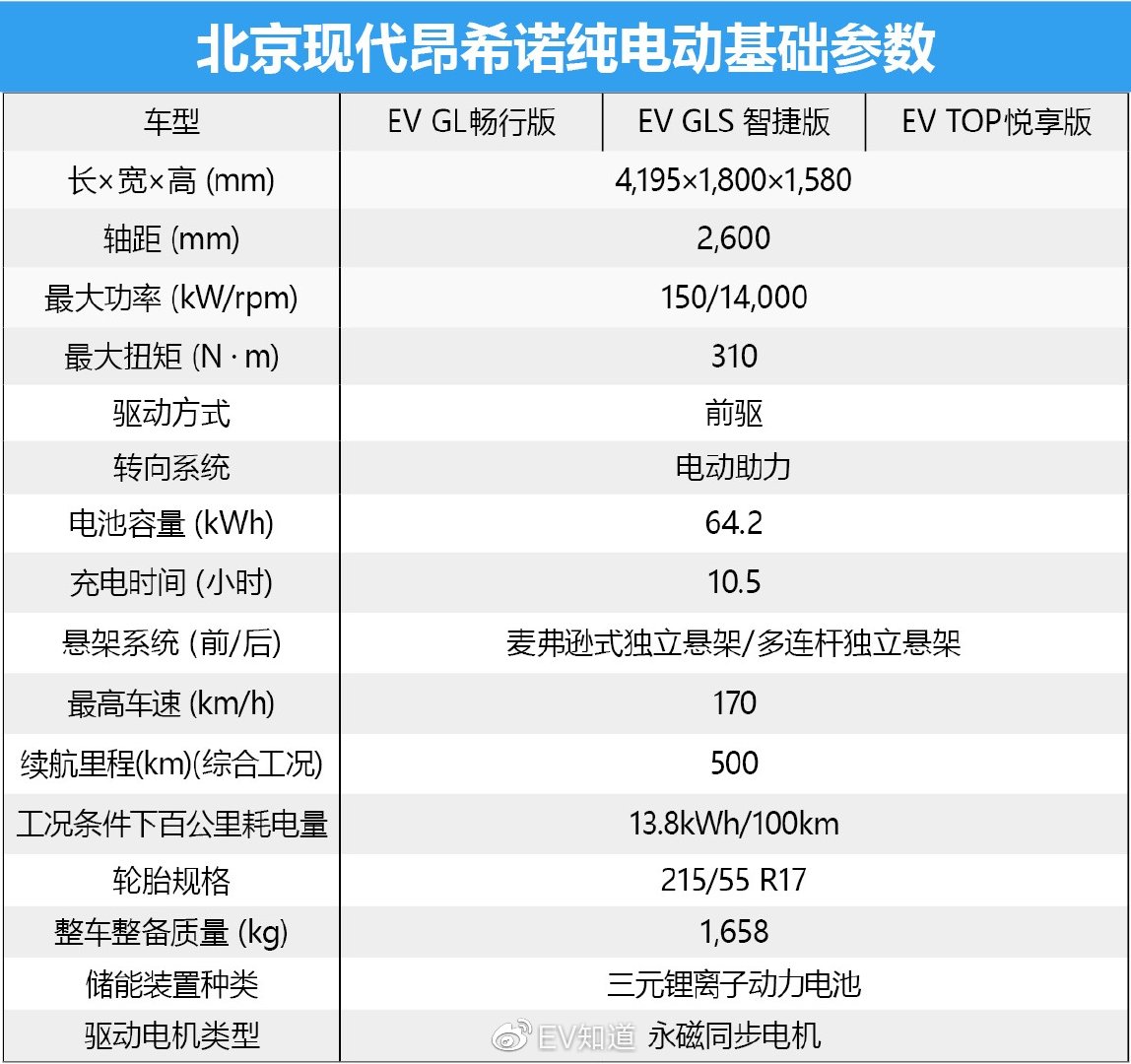 北京现代昂希诺纯电动将搭载宁德时代的三元锂电池(NCM523),电池容量为64.2kWh,能量密度为141Wh/kg,最高充电功率为70kW;同时北京现代昂希诺纯电动还将搭载大陆电子的三合一集成电驱系统,最大功率150kW(204Ps),最大扭矩310N·m;NEDC续航里程将达到500km,电耗为13.8kWh/100km,0-50km/h加速时间3.5s,最高时速170km/h。