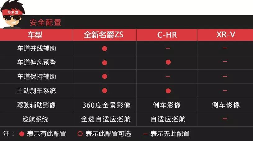 全新名爵ZS在安全配置上也要比两个对手更胜一筹,它搭载了与博世合作的L2+自动驾驶辅助系统(MG PILOT L2+),拥有TJA交通拥堵辅助和ICA集成式高速智能巡航功能,可实现全速段自适应巡航。C-HR配备了自适应巡航、车道偏离预警、主动刹车功能。而XR-V在安全配置方面就比较寒酸了,全系只有顶配车型旗舰版搭载了主被动安全配置。