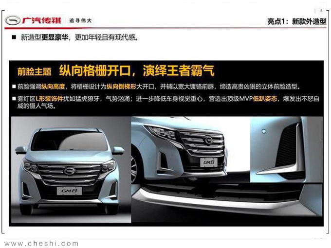 新车减配前雾灯设计,由L形獠牙状镀铬装饰替代,实用性有所降低;尾部换装双边双出“8”形排气,提升了整个尾部的视觉冲击力。传祺第三代390T缸内直喷涡轮增压发动机满足国六b排放标准,百公里综合油耗由2019款的8.9L下降至8.5L,和别克GL8 (配置|询价)商旅车保持一致。