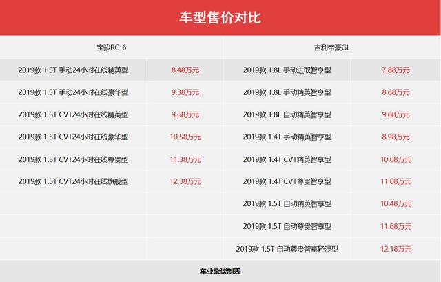 宝骏RC-6售价8.48-12.38万元,吉利帝豪GL售价7.88-12.18万元,两者处于10万元左右价格预算中,不过从整体价格门槛来看,帝豪GL要比之RC-6更亲民,并且在车型选择面上也更丰富。好在,在自动挡车型的入门上RC-6还是能够与对手持平。
