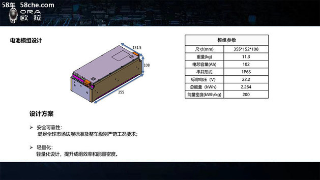 欧拉R1的模组设计采用一并6串,整包电池共有15个模组,1并90串。单一模组的重量为11.3kg,总能量为2.26kWh。模组采用轻量化设计,来保证提升成组效率和模组能量密度。