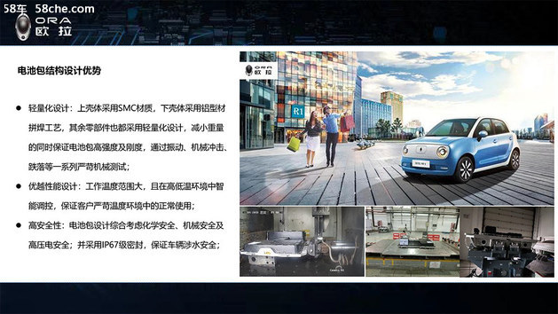 欧拉品牌动力电池壳体采用SMC材质及铝型材拼焊工艺,其余零部件也都采用轻量化设计,减小重量的同时保证电池包高强度及刚度。并且采用了优越性能设计,工作温度范围大,且在高低温环境中智能调控,保证客户严苛温度环境中的正常使用。经过严格的化学性、机械性安全测试,兼顾性能和可靠性。