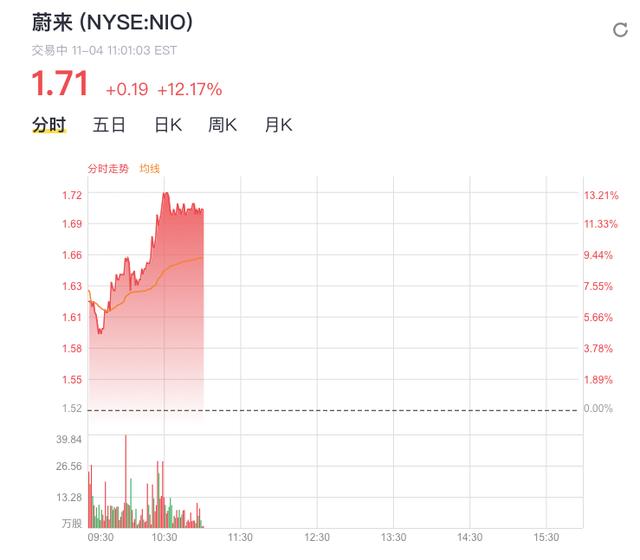 截止至发稿前,得益于销量的提升,蔚来汽车股价上涨12.17%,报1.71美元。