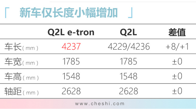 Q2L e-tron整体尺寸与燃油版车型基本保持一致,动力方面搭载了一台最大功率为100kW的驱动电机,峰值扭矩为290N·m,最高车速为150km/h。电池和续航方面,Q2L e-tron搭载由宁德时代提供的三元锂电池组,电池系统能量密度为121Wh/kg,远低于目前主流电动车150Wh/kg的水平,NEDC工况下续航里程仅为265km。
