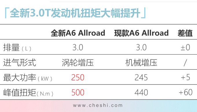 全新A6旅行版车身尺寸相比现款车型全面提升,动力方面将搭载2.0T、3.0T发动机,其中3.0T发动机配备48V轻混系统,最大功率为250kW,峰值扭矩为500N·m。传动系统新车匹配7速双离合变速箱,配备quattro四驱系统。