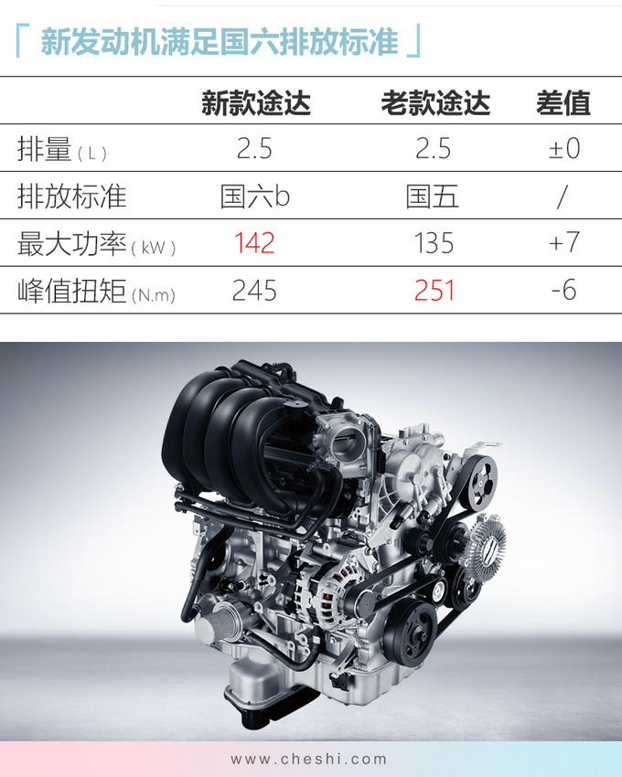 动力方面,新款途达搭载的2.5L自然吸气发动机满足国六b排放标准,最大功率为142kW,峰值扭矩为245N·m,动力参数远不及福特撼路者、哈弗H9 (配置|询价)的2.0T发动机。新车传动系统匹配6速手动或7速自动变速箱,顶配和次顶配带有分时四驱系统,可根据路面情况,通过接通或断开分动器来变化两轮驱动或是四轮驱动模式,兼顾了越野性能和燃油经济性。