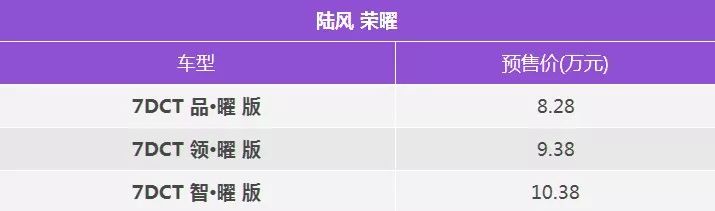 首先要清楚的是,按照惯例每款车的预售价都会比正式指导价要高些,即使不考虑这点因素,陆风荣曜最低配车型8.28万的售价,也算是竞争力十足。虽然目前只推出3款车型,关键一点,这三款车型都是自动挡。就如官方宣称的,陆风荣曜是一款没有“丐版”的车型,全系标配了标配ESC车身电子稳定系统、电子换挡、换挡拨片、定速巡航、一键启动、无钥匙进入、自动驻车、车载多媒体系统、倒车影像9大配置;同时在安全配置方面,这款车还配备了共计66项主被动安全装置,考虑到这些原因,比起同级别车型陆风荣曜无疑更具竞争力。
