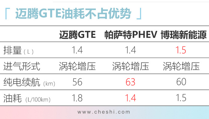 网上车市从一汽-大众官方获悉,中期改款迈腾 插电混动版(以下称迈腾GTE)将于11月11日亮相。新车搭载一套由1.4T发动机+电动机组成的插电混动系统,纯电续航里程56km,每百公里油耗1.8L,远低于同排量燃油版车型5.8L/100km的油耗水平,也比本田雅阁 (配置|询价)混动(4-4.4L/100km)、丰田凯美瑞 (配置|询价)混动(4.1L/100km)省油。
