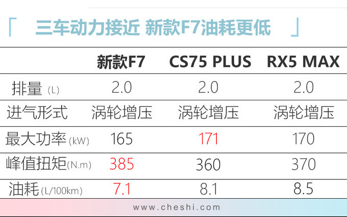 动力方面,新款F7搭载1.5T、2.0T发动机,最大功率为124kW、165kW,峰值扭矩285N·m、385N·m,传动系统匹配7DCT变速箱,均满足国六排放标准。新款F7一定程度上弥补了现款车型的不足,并且新增了2.0T入门版,减低了对于动力有高要求用户的购车门槛。