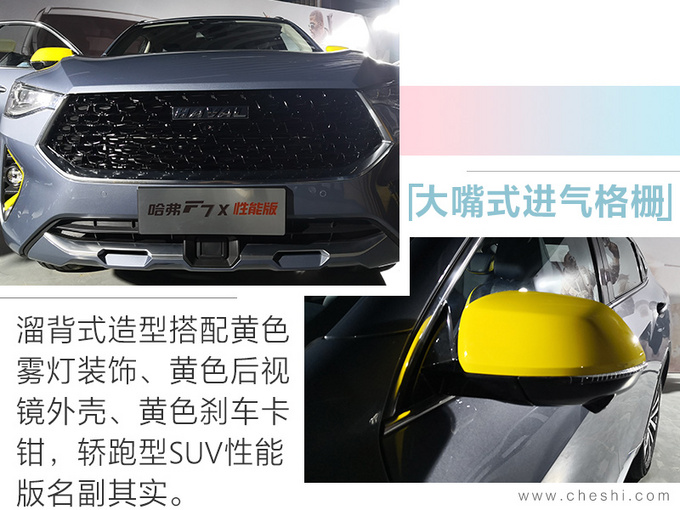外观方面,哈弗F7x性能版采用专属星云灰配色,前脸造型延续家族式设计,大嘴式灰黑色进气格栅搭配双色大灯,具有较强的视觉冲击力;两侧雾灯区域采用黄色运动套件装饰;尾部排气布局为双边单出式,同样采用黄色运动套件包裹,整体运动感十足。