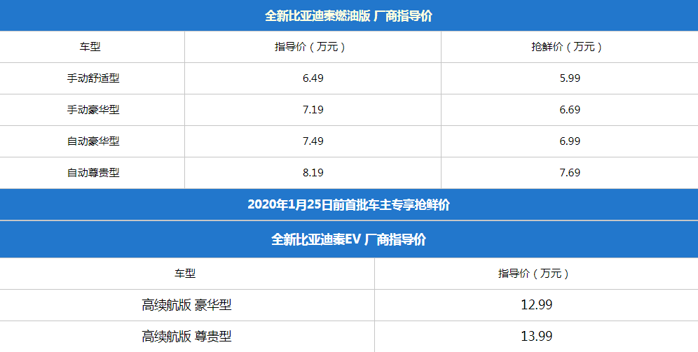 11月5日,比亚迪全新一代秦燃油版和EV车型正式上市。秦燃油版搭载1.5L+CVT动力总成,共推出四款车型,厂商指导价为6.49-8.19万元,2020年1月25日前首批车主还可以专享到抢鲜价格;秦EV纯电动版搭载最大功率100kW(136Ps)的电动机,NEDC续航里程为421km,推出两款车型,厂商指导价为12.99-13.99万元。