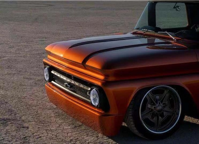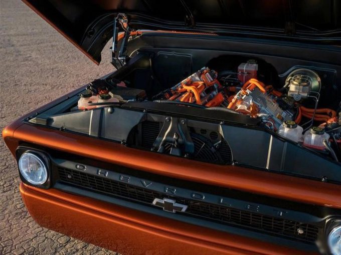 从图片中,可以看到,这款雪佛兰电动皮卡设计非常经典,极具肌肉感。该车采用单排座椅驾驶室,低趴造型。前大灯采用老式凸起的圆形形状, 引擎盖设有线条,以适应风流,减少风阻。该车前格栅具有Chevrolet的logo,非常经典。