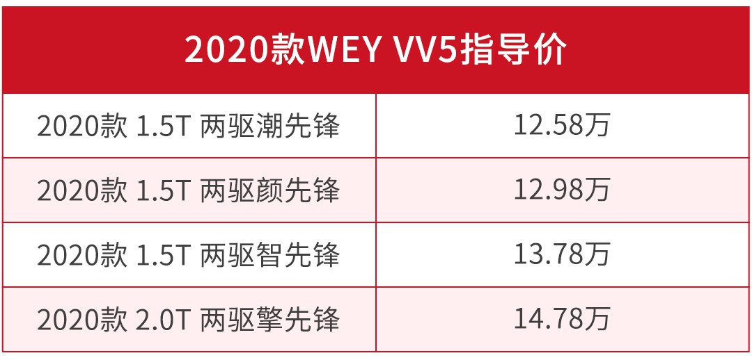 作为WEY品牌的最新力作,2020款VV5目前共有4款车型可选,其中1.5T有3款,2.0T有1款,售价区间在12.58-14.78万元。