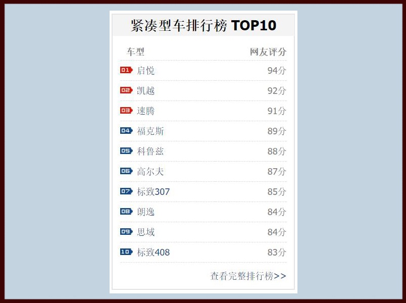 紧凑型轿车历来就是消费者所最常购买的车型,由于车价一般都在10万元左右,再加上可满足基本需求的乘坐空间和良好的燃油经济性,国内也诞生了很多的热销紧凑型轿车。像大众朗逸 (配置|询价)、日产轩逸、别克英朗、丰田卡罗拉等等就都是一些热门的车型,老百姓对它们是爱不释手,市场对它们也是“毕恭毕敬”,因此这个级别的车型其实一般都不愁卖不出去。那对于咱们消费者而言,这类车型又该怎么去选呢?毕竟现在市面上的紧凑型车真的是太多了,一般人很难选好。鉴于这个问题,其实要师哥推荐也无非不就是那些,所以还是老规矩,用网友们所评选出来口碑排行榜来说话吧,毕竟至少在我看来这份榜单还是有点参考性的,下面一起来看看。