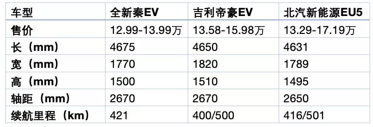 毫无疑问,技术领先的e平台给全新秦EV带来了非常大的升级,大空间、长续航、安全、智能等都是全新秦EV的亮点。在和同级竞品帝豪EV、北汽EU5 (配置|询价)的对比中,全新秦EV车长有明显优势,轴距和EU5一致,处于同级领先的水平。而续航里程方面,帝豪EV和EU5都提供有两个版本,高续航版本都达到500km,有明显优势,但是价格都比较高。相比之下,全新秦EV的续航为421公里,但是售价仅为12.99万起,帝豪EV和EU5更低续航的版本售价都比全新秦EV高,因此全新秦EV的高性价比一目了然,是更具价值的选择。