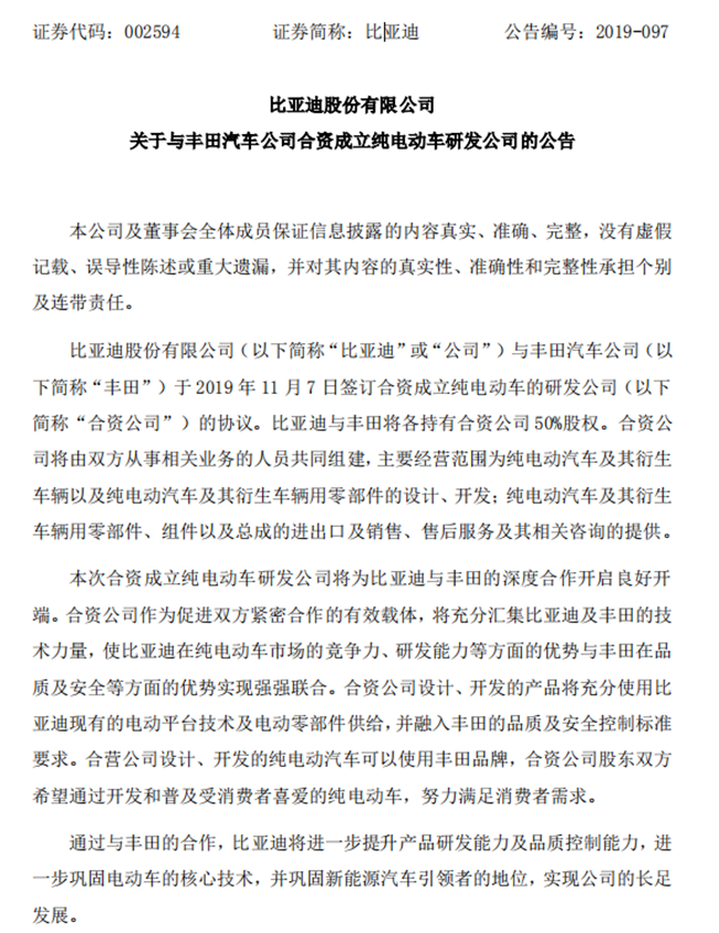 而在国内市场,又一家50:50的新能源汽车合资公司在此时应运而生,这次“联姻”的主角是全球汽车巨头丰田汽车和中国新能源汽车领导者比亚迪。2019年11月7日,丰田汽车公司与比亚迪股份有限公司签订合资协议。新公司将于2020年在中国正式成立,丰田与比亚迪各出资50%。这是继江淮大众、众泰福特、长城和宝马的光束汽车之后,又一家中外合资的新能源汽车企业。