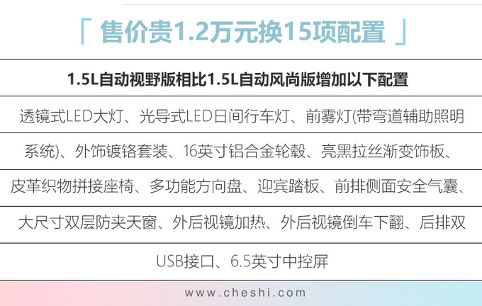 其他配置上,朗逸视野版增加的透镜式LED大灯、外后视镜加热/倒车下翻、多功能方向盘以及后排双充电接口等配置,提升了消费者用车时的便利性。同时新车配备的外观镀铬套装、内饰饰板以及迎宾踏板,让车辆的外观和内饰豪华感也得到了明显的提升。
